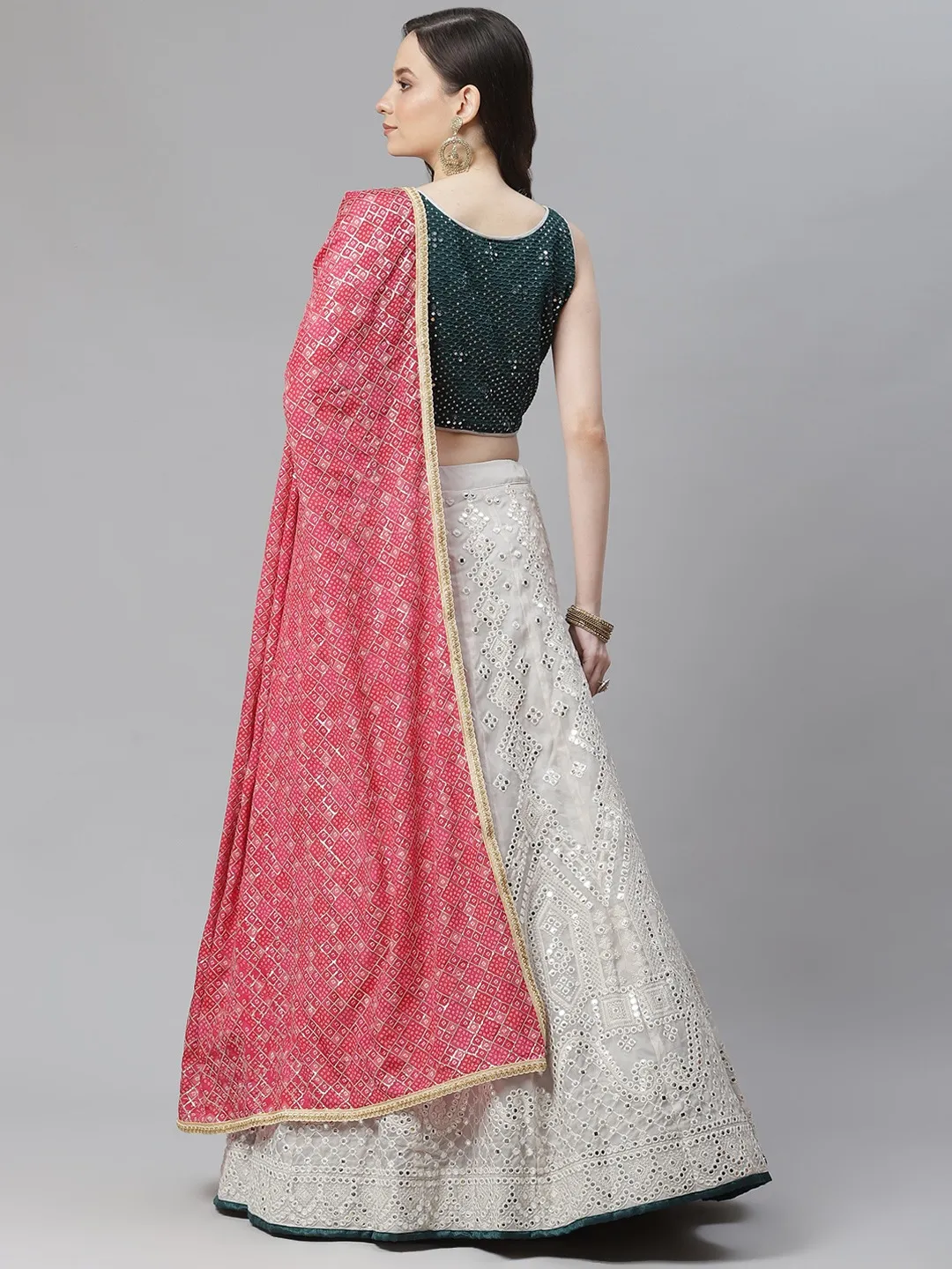 Organza Silk Fabric Cream Colour Semi-Stitched Lehenga in Resham,Mirror Work & Choli with Bandhej Printed Dupatta