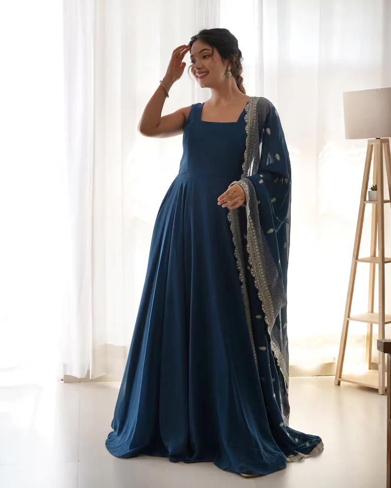 PRESENTING NEW PURE SOFT FOX GEORGETTE FULLY FLAIR GOWN,FANCY EMBROIDERY SEQUENCE CUTWORK DUPPTA SET READY TO WEAR FULLY STTICHED